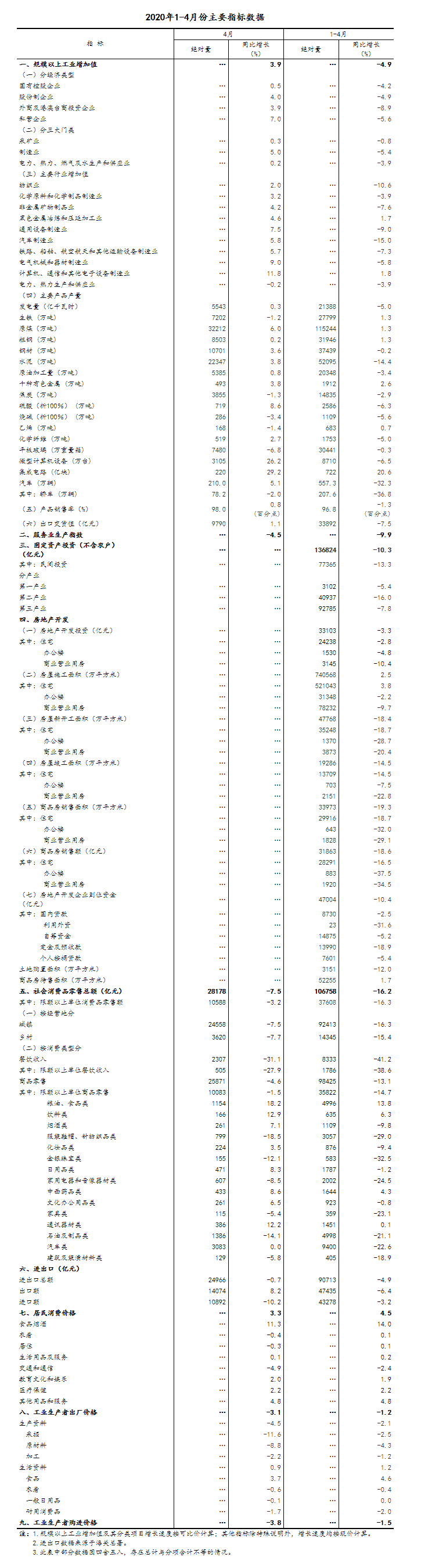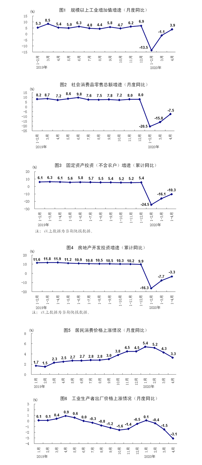 总的来看,4月份主要经济指标有所改善,我国经济运行正逐步向常态化复苏。同时也要看到,当前境外疫情仍在扩散蔓延,国内经济稳定复苏仍面临诸多挑战。面对复杂局面,要以习近平新时代中国特色社会主义思想为指导,统筹推进疫情防控和经济社会发展工作,在疫情防控常态化前提下,坚持稳中求进工作总基调,坚持新发展理念,坚持以供给侧结构性改革为主线,扎实做好“六稳”工作,全面落实“六保”任务,有效扩大国内需求,着力助企纾困,稳住经济基本盘,力促经济平稳健康发展,确保完成决战决胜脱贫攻坚目标任务,全面建成小康社会。