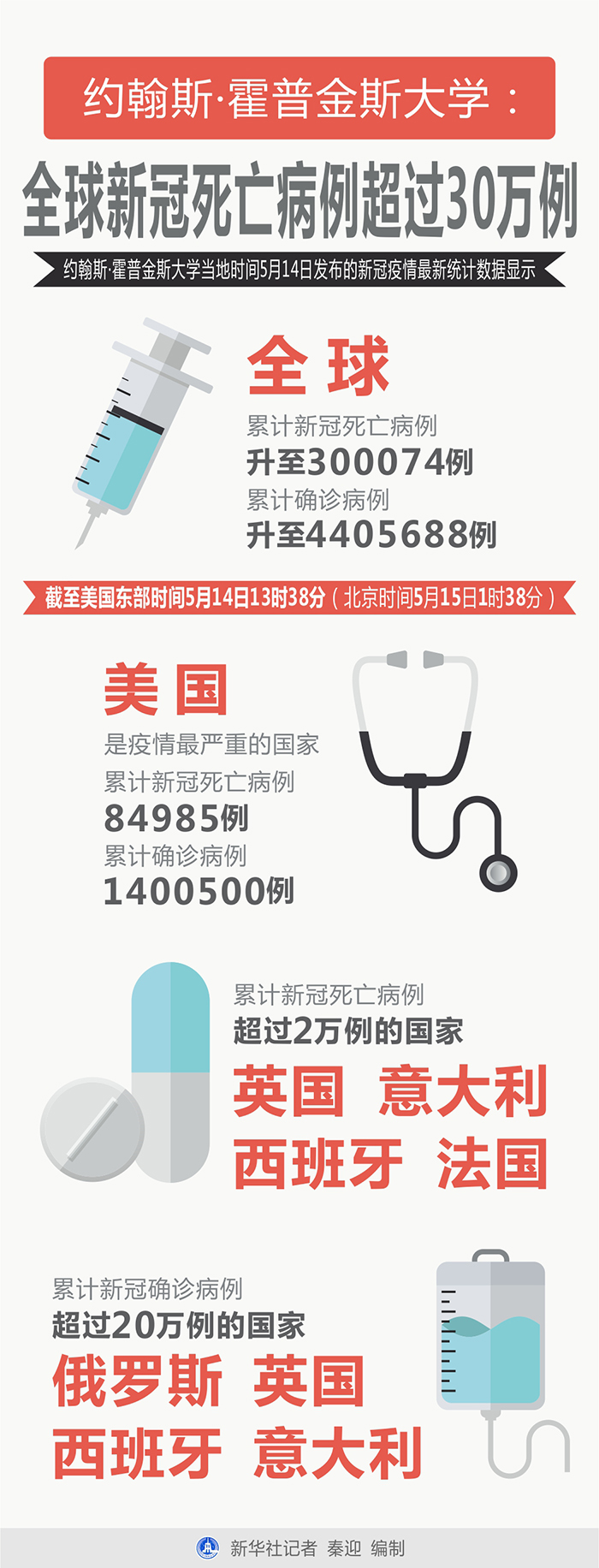 新华社北京5月15日电 14日全球疫情简报:美研究机构统计美国新冠确诊超140万 全球病亡超30万