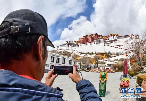 3月1日,布达拉宫管理处讲解员次仁卓嘎(右)在进行直播。 新华社记者 春拉 摄