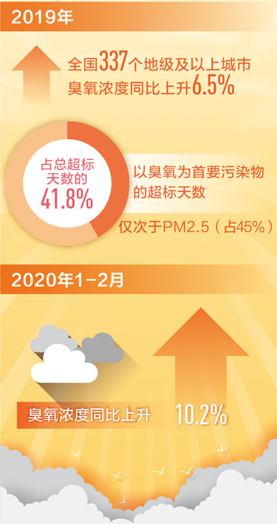 这几年,全国空气质量持续改善,臭氧浓度却不降反升。2019年,全国337个地级及以上城市臭氧浓度同比上升6.5%,以臭氧为首要污染物的超标天数占总超标天数41.8%,仅次于PM2.5(占45%)。臭氧浓度大幅上升造成全国空气质量优良天数比例同比损失2.3个百分点。今年1—2月,臭氧浓度更是蹿升了10.2%。
