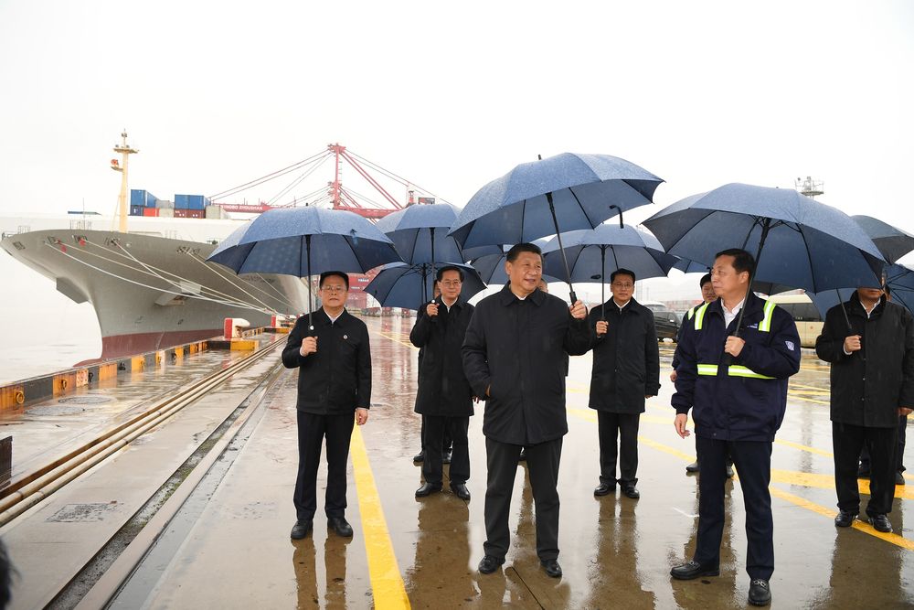 3月29日至4月1日,中共中央总书记、国家主席、中央军委主席习近平在浙江考察。这是3月29日,习近平在宁波舟山港穿山港区2号集装箱泊位,了解港口作业情况。(申宏/摄)
