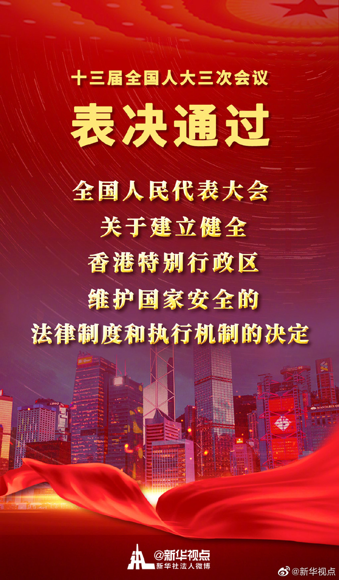 两会新华社快讯:十三届全国人大三次会议表决通过了全国人民代表大会关于建立健全香港特别行政区维护国家安全的法律制度和执行机制的决定。