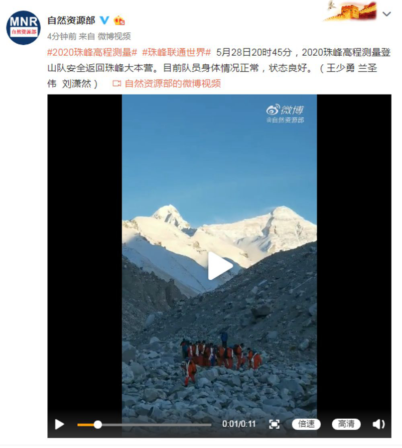 珠峰高程测量登山队安全返回珠峰大本营