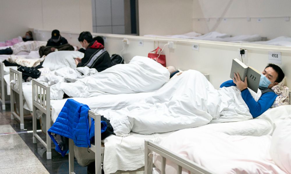 2月5日晚,一名患者在武汉“江汉方舱医院”内看书。新华社记者熊琦摄