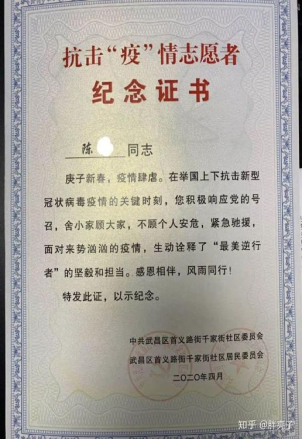 在武汉,网友“胖亮子”说,2月底,他的妻子接到下沉社区做志愿者的通知,可以自愿选择,但她很快答应了。“平时有点洁癖而且胆小的老婆在这个时候能够挺身而出,让我刮目相看。”