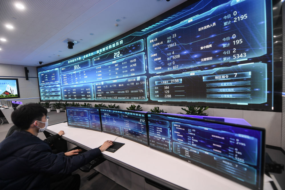 4月2日,在杭州市余杭区疫情防控工作领导小组指挥部内,杭州城市大脑精密智控防疫系统显示疫情防控动态各项实时数据。新华社记者 徐昱 摄