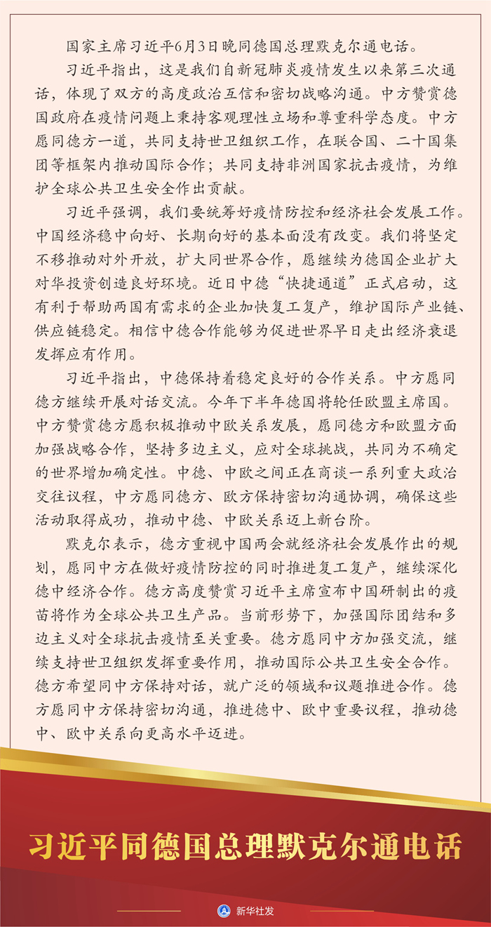 习近平指出,这是我们自新冠肺炎疫情发生以来第三次通话,体现了双方的高度政治互信和密切战略沟通。中方赞赏德国政府在疫情问题上秉持客观理性立场和尊重科学态度。中方愿同德方一道,共同支持世卫组织工作,在联合国、二十国集团等框架内推动国际合作;共同支持非洲国家抗击疫情,为维护全球公共卫生安全作出贡献。