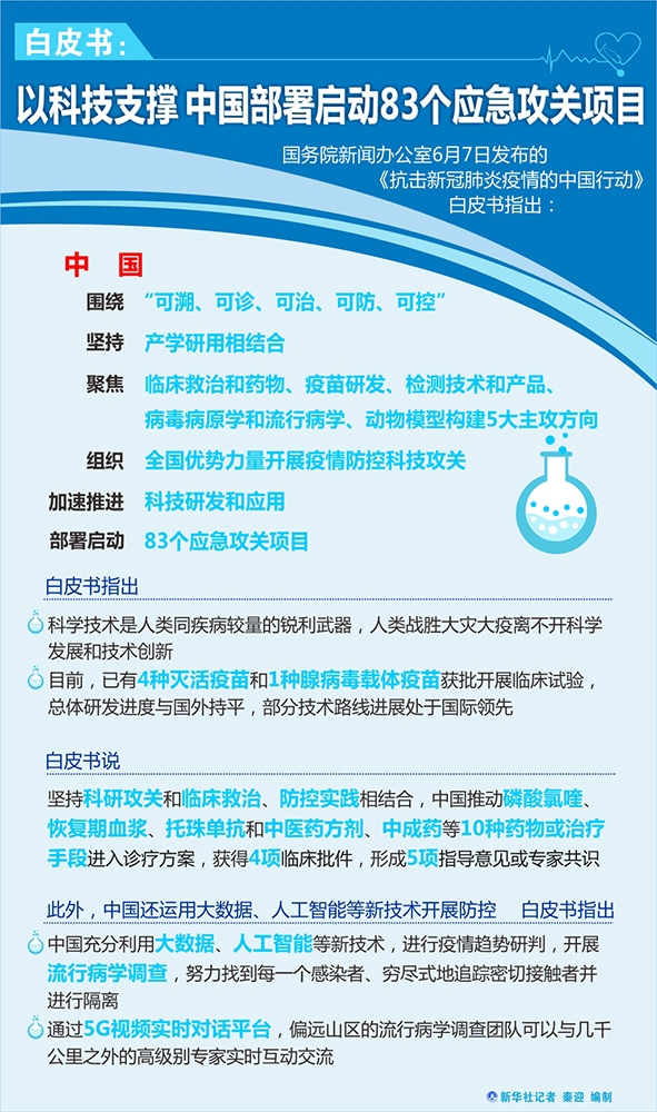 新华社北京6月7日电(记者胡喆)国务院新闻办公室7日发布的《抗击新冠肺炎疫情的中国行动》白皮书指出,中国围绕“可溯、可诊、可治、可防、可控”,坚持产学研用相结合,聚焦临床救治和药物、疫苗研发、检测技术和产品、病毒病原学和流行病学、动物模型构建5大主攻方向,组织全国优势力量开展疫情防控科技攻关,加速推进科技研发和应用,部署启动83个应急攻关项目。