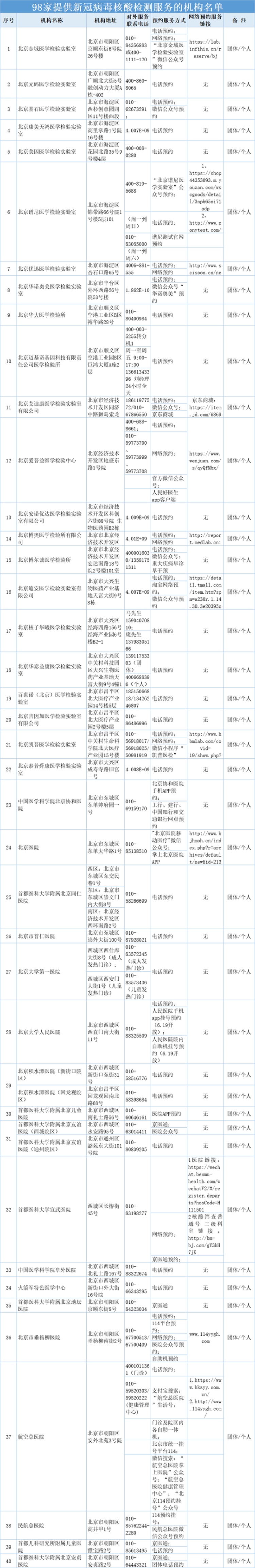 2020年4月15日、5月11日,我市分别公布了46所和21所,面向团体和个人提供新冠病毒核酸检测服务的医疗卫生机构。截至6月13日,我市又新增31家具备核酸检测能力的医疗卫生机构,可面向团体和个人提供新冠病毒核酸检测服务。目前我市具备核酸检测能力的机构达到98所,每天最大检测能力已达9万多人。根据防控工作需要,为便于群众预约查询,我委汇总了检测机构的网络预约链接和APP、微信公众号等信息。现将面向社会团体和个人提供新冠病毒核酸检测服务的98所医疗卫生机构名单予以公布,有检测需求的单位和个人,请提前进行预约。