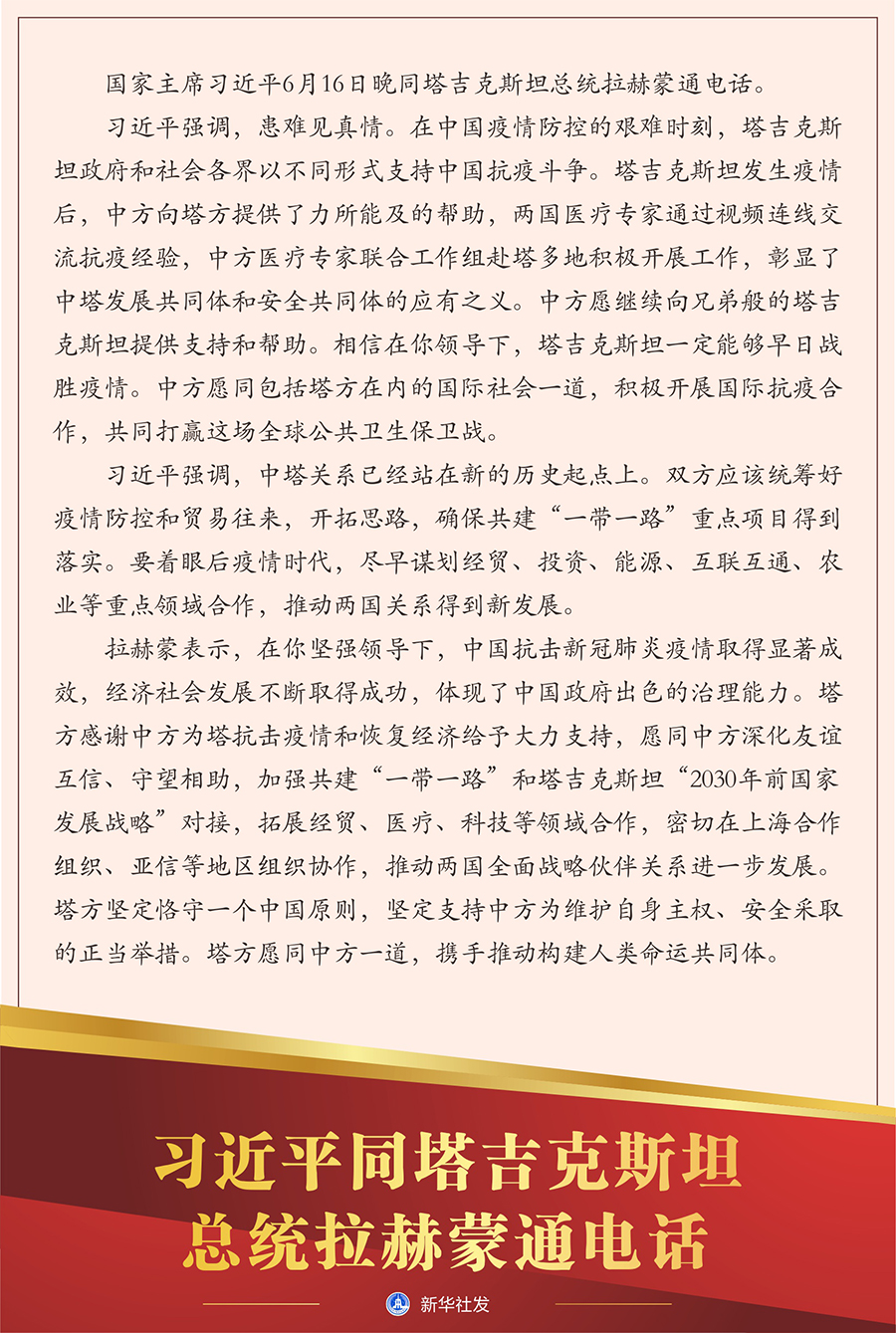 新华社北京6月16日电 国家主席习近平6月16日晚同塔吉克斯坦总统拉赫蒙通电话。