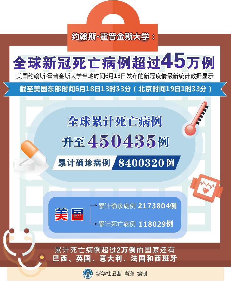 新华社纽约6月18日电 美国约翰斯·霍普金斯大学18日发布的新冠疫情最新统计数据显示,全球累计死亡病例超过45万例。