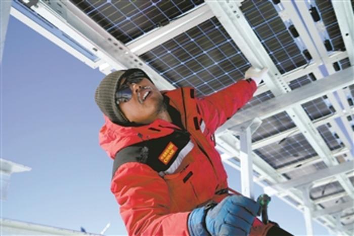 曾应根为泰山站新能源系统安装光伏太阳能板。受访者供图