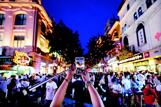 一位游客手机拍摄夜色中的中央大街(资料片)。本报记者王建威摄