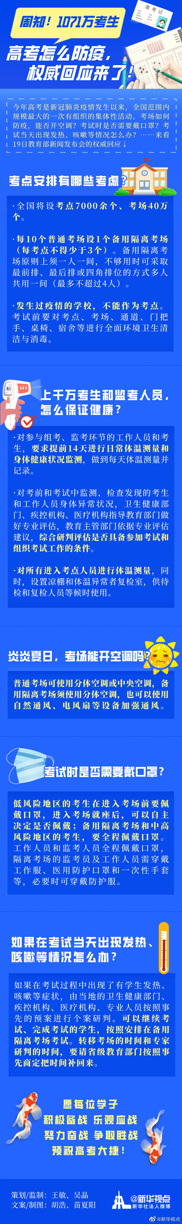 半个多月以后的7月7日和8日,1071万考生将迎来人生当中的一次大考。今年高考是新冠肺炎疫情发生以来,全国范围内规模最大的一次有组织的集体性活动。考场如何防疫,能否开空调?考试时是否需要戴口罩?考试当天出现发热、咳嗽等情况怎么办?……来看19日教育部新闻发布会的权威回应↓