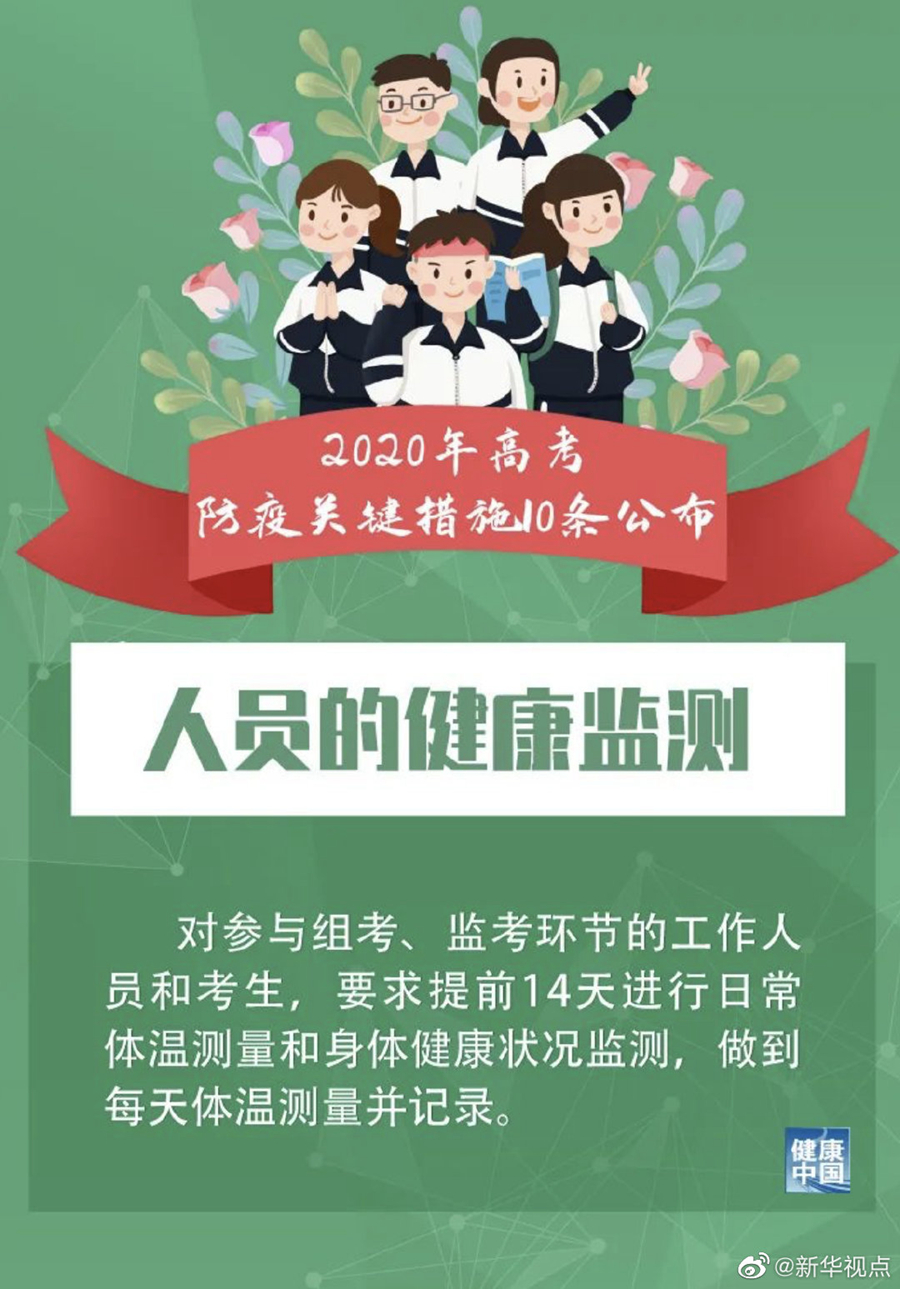 此外,措施提到,对参与组考、监考环节的工作人员和考生,要求提前14天进行日常体温测量和身体健康状况监测,做到每天体温测量并记录。