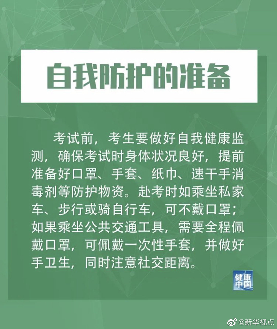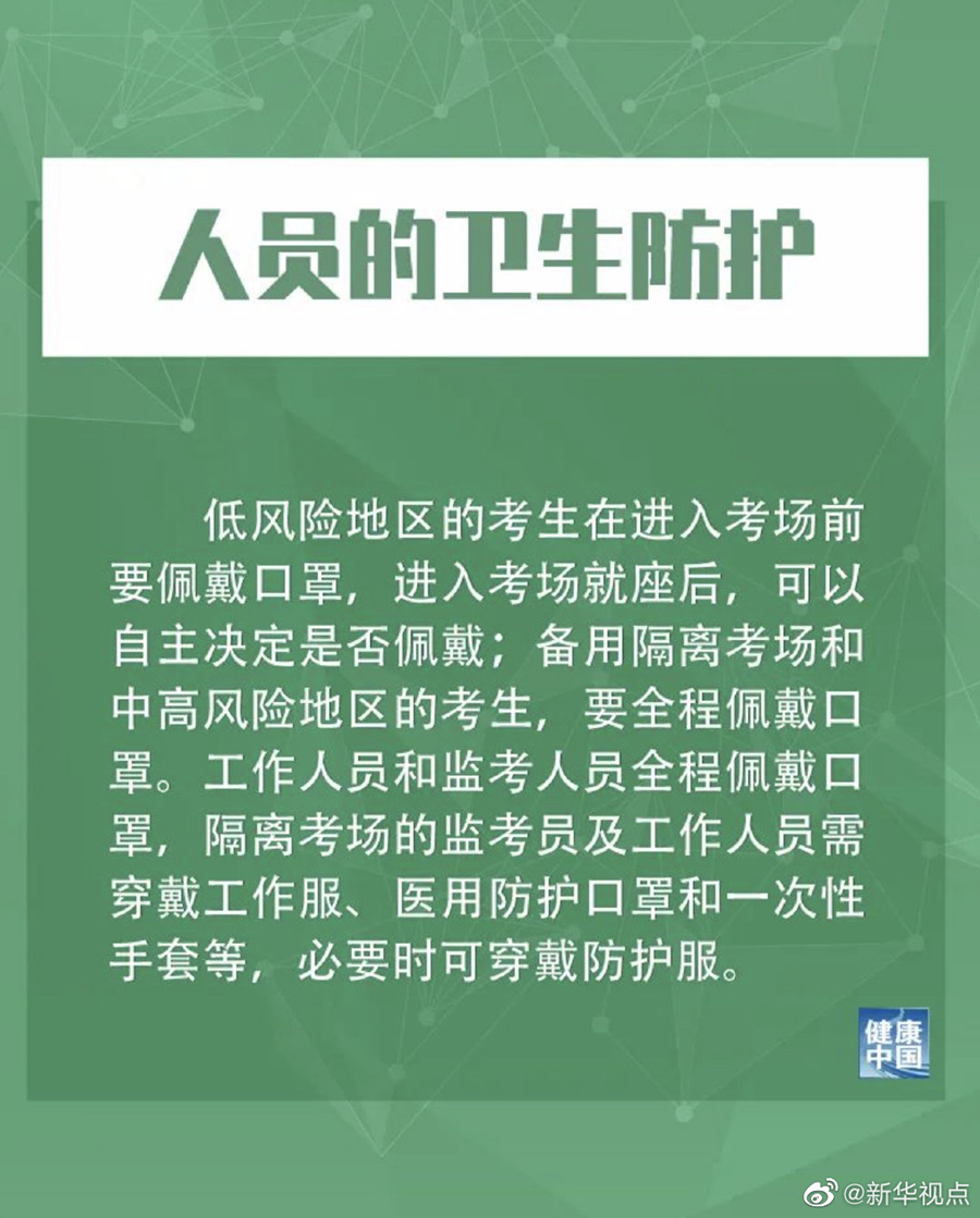 措施提到,低风险地区的考生在进入考场前要佩戴口罩,进入考场就座后,可以自主决定是否佩戴;备用隔离考场和中高风险地区的考生,要全程佩戴口罩。工作人员和监考人员全程佩戴口罩,隔离考场的监考员及工作人员须穿戴工作服、医用防护口罩和一次性手套等,必要时可穿戴防护服。