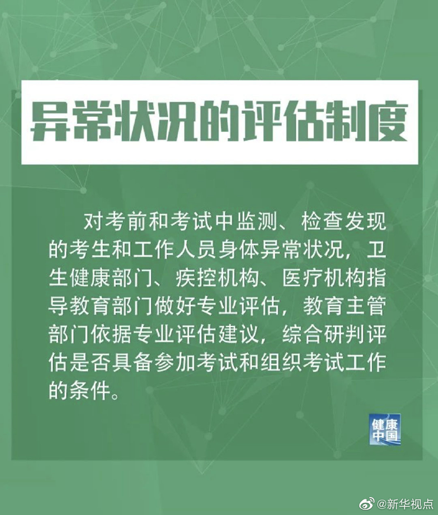 考试过程中有发热、咳嗽等呼吸道症状者,措施提到,由考点当地的卫生健康部门、疾控机构和医疗机构专业人员进行个案研判,具备继续完成考试条件的考生,须安排在备用隔离考场考试。考生从普通考场转移至备用隔离考场(未出考点)所耽误的时间,经省级招生考试机构批准予以补齐。当科目考试结束时,由负责研判的专业人员当场简要向所有考生进行解释和说明,避免其他考生恐慌。