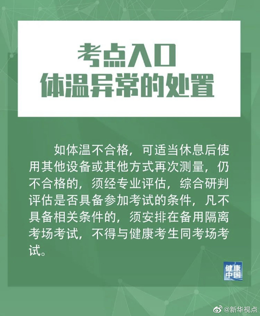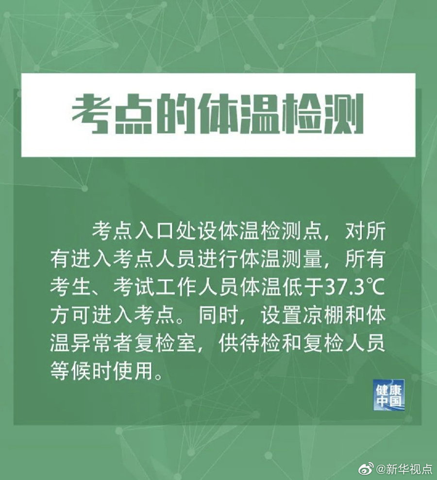 新华社北京6月25日电(记者王琳琳)国家卫健委官网日前发布10条2020年高考防疫关键措施。其中提到,所有考生、考试工作人员体温低于37.3℃方可进入考点。如体温不合格,可适当休息后使用其他设备或其他方式再次测量,仍不合格的,须经专业评估,综合研判评估是否具备参加考试的条件,凡不具备相关条件的,须安排在备用隔离考场考试,不得与健康考生同考场考试。