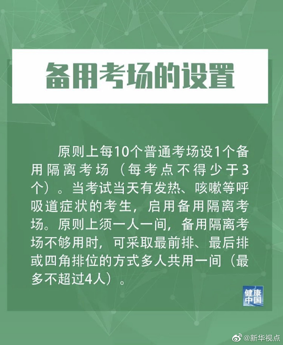 对于备用考场的设置,措施提到,原则上每10个普通考场设1个备用隔离考场(每考点不得少于3个)。当考试当天有发热、咳嗽等呼吸道症状的考生,启用备用隔离考场。原则上须一人一间,备用隔离考场不够用时,可采取最前排、最后排或四角排位的方式多人共用一间(最多不超过4人)。