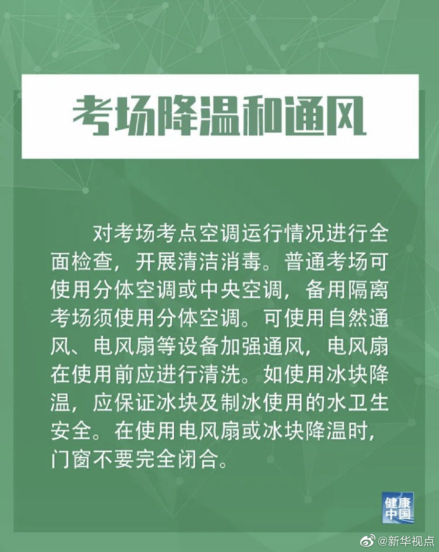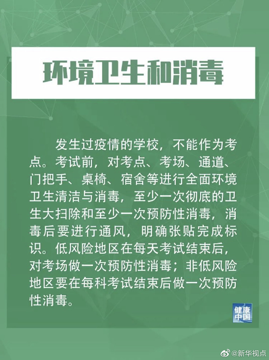 措施提到,发生过疫情的学校,不能作为考点。低风险地区在每天考试结束后,对考场做一次预防性消毒;非低风险地区要在每科考试结束后做一次预防性消毒。