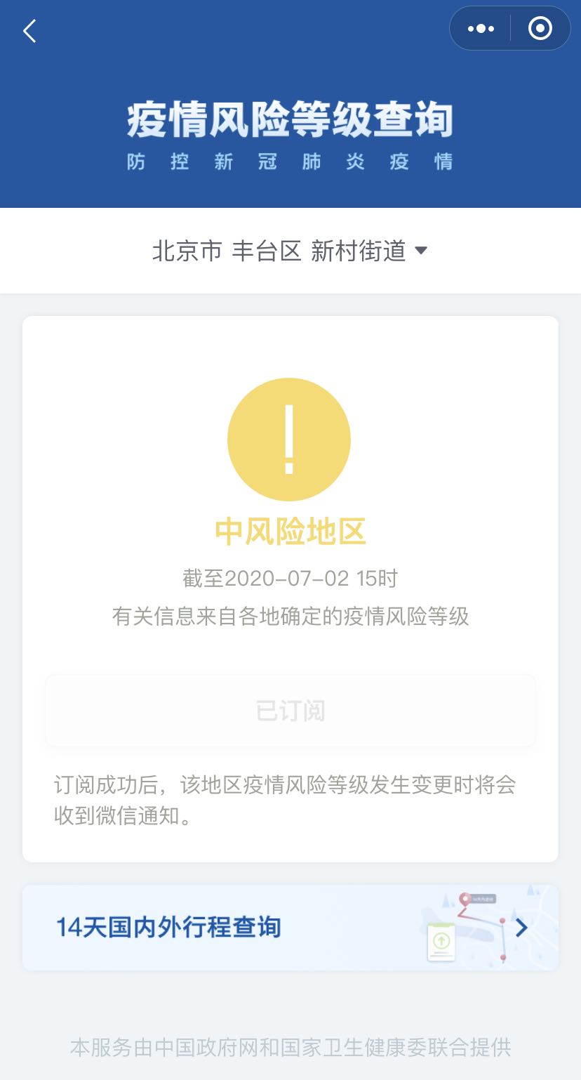 记者从国务院客户端小程序“疫情风险等级查询”了解到,截至7月2日15时,北京市丰台区新村街道由高风险地区降级为中风险地区。