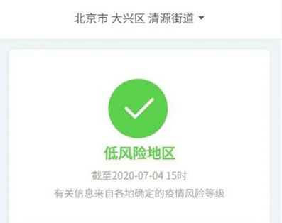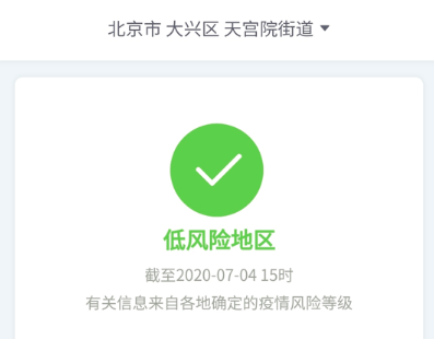 北京日报记者从国务院客户端小程序“疫情风险等级”了解到,截至7月4日15时,北京市大兴区天宫院街道、清源街道由中风险地区调整为低风险地区;北京市大兴区黄村(地区)镇由高风险降级为中风险。