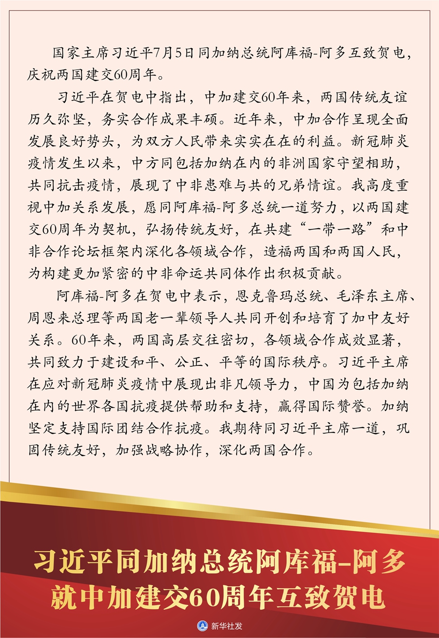 新华社北京7月5日电 国家主席习近平7月5日同加纳总统阿库福-阿多互致贺电,庆祝两国建交60周年。