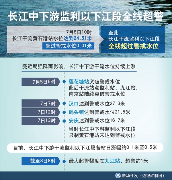 新华社武汉7月8日电(记者李思远、乐文婉)8日10时,长江干流黄石港站水位达到24.51米,超过警戒水位0.01米。至此,长江干流监利以下江段全线超过警戒水位。