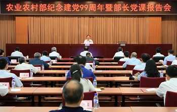 6月29-30日,农业农村部开展党组理论学习中心组(扩大)学习,部党组书记、部长韩长赋在农业农村部纪念建党99周年大会暨部长党课报告会上作总结讲话。他强调,部系统各级党组织和党员干部要深入学习领会习近平总书记关于强化政治机关意识、加强中央和国家机关党的政治建设以及关于力戒形式主义、官僚主义的重要论述,牢固树立政治机关意识,进一步增强“四个意识”,坚定“四个自信”,做到“两个维护”,当好“三个表率”,走好第一方阵,力戒形式主义、官僚主义,全面提高部系统党的建设质量,推动全面从严治党向纵深发展,努力建设让党中央放心、让人民群众满意的模范机关,为实施乡村振兴战略、加快农业农村现代化提供坚强政治和组织保证。