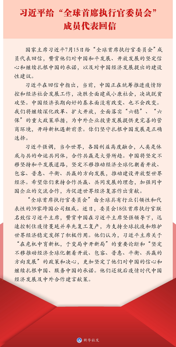 新华社北京7月16日电 国家主席习近平7月15日给“全球首席执行官委员会”成员代表回信,赞赏他们对中国和平发展、开放发展的坚定信心和继续扎根中国的承诺,以及对中国经济发展提出的建设性建议。
