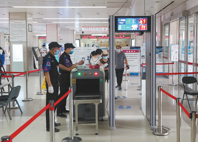 7月10日,记者走进首都医科大学附属北京朝阳医院,进门先要过“三道关”:一是登记关。门诊楼东门广场,围出几条患者通道,没有智能手机的老人要带身份证、医保卡,由医务人员帮助填写流行病等筛查表,其他人则出示健康码,按一米线排队进入。二是安检关。进门处装有两套智能安检筛查系统,大包小件都得过一遍。三是手检关。如果安检系统报警或安检员发现异常,就要进行人工手检。