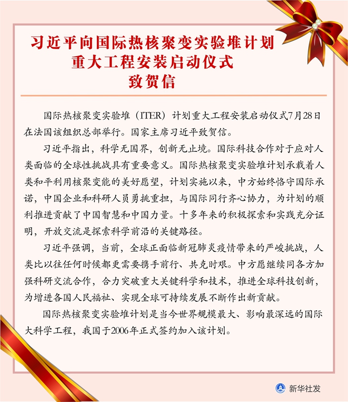 新华社北京7月28日电 国际热核聚变实验堆(ITER)计划重大工程安装启动仪式7月28日在法国该组织总部举行。国家主席习近平致贺信。