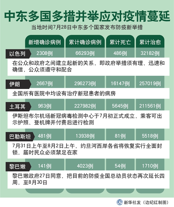 新华社突尼斯7月29日电 综合新华社驻中东地区记者报道:为进一步应对中东多国持续蔓延的新冠疫情,同时防止因宰牲节人群聚集加剧疫情扩散,中东多个国家28日发布防疫新举措。
