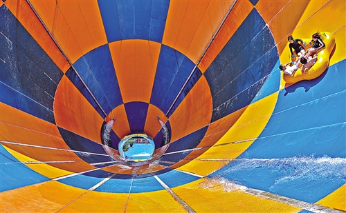 日前,游客在山东烟台37度梦幻海水乐园体验“深海龙卷风”游乐项目。孙文潭摄(中经视觉)