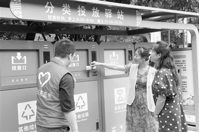 在金华市金东区的每个垃圾投放点附近,都有一名垃圾巡检员会协助居民做好分类,定时、定点投放垃圾。