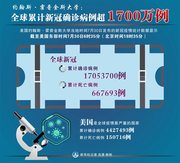 新华社纽约7月30日电 美国约翰斯·霍普金斯大学30日发布的新冠疫情统计数据显示,截至美国东部时间30日6时35分(北京时间18时35分),全球累计确诊病例达到17053700例,累计死亡667693例。