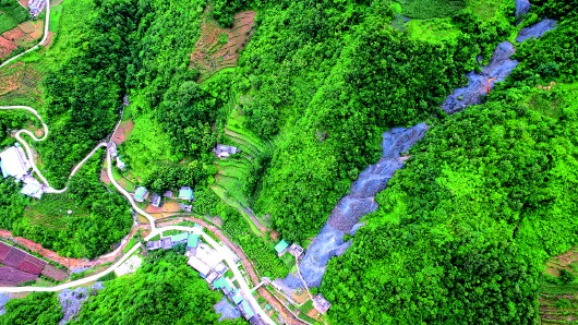 这是7月5日拍摄的白河县卡子镇凤凰村从山顶延伸到山脚的硫铁矿渣(无人机照片)。记者梁爱平摄