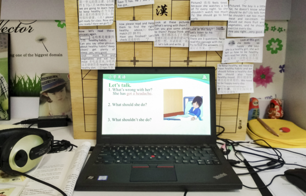 2月17日,北京中关村第三小学英语老师鲁凤玲在家中为学生录制“国家中小学网络云平台”教学内容,电脑附近贴满了用来提词的纸条