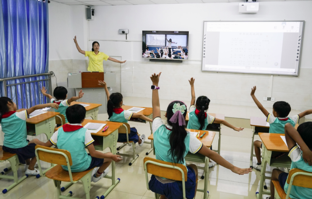 三沙市永兴学校老师张利带着学生,通过远程在线教育系统,与海口市滨海第九小学的老师和学生一起上音乐课 (沈伯韩/摄)