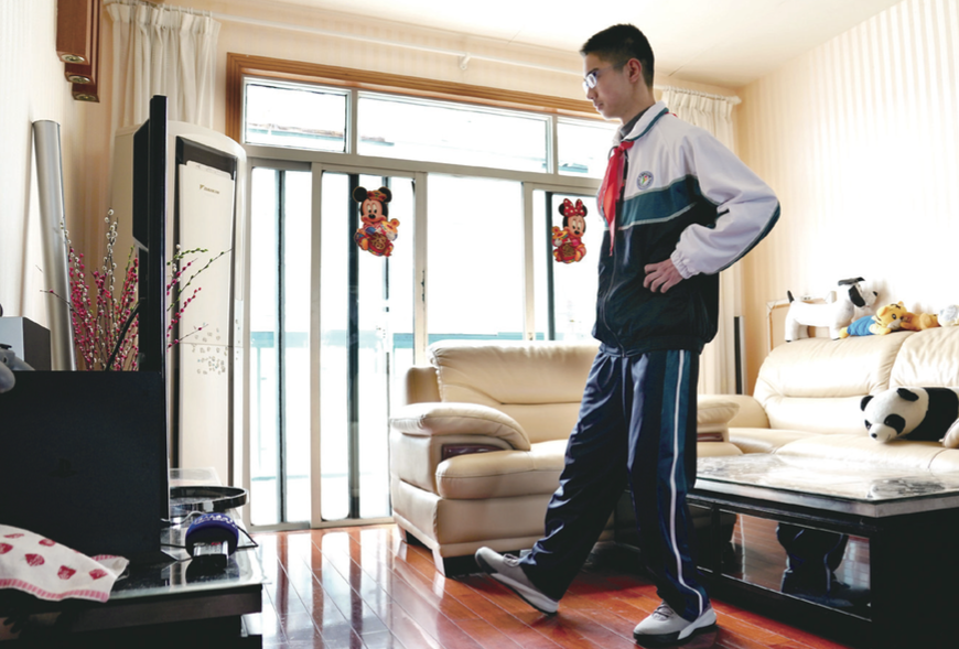 3月2日,上海市三门中学初二学生孙旭涵跟随在线教育体育课老师学习居家健身操(刘颖 / 摄)