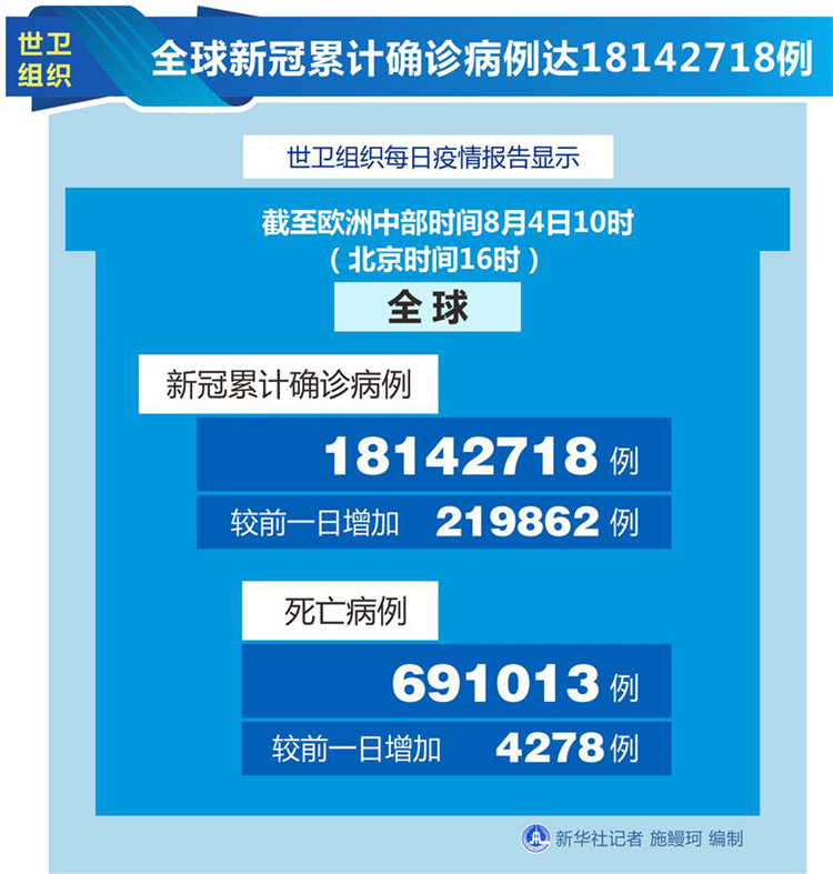 世卫组织每日疫情报告显示,截至欧洲中部时间4日10时(北京时间16时),全球确诊病例较前一日增加219862例,达到18142718例;死亡病例增加4278例,达到691013例。