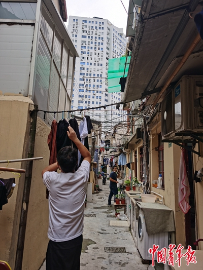 7月16日,上海宝昌路棚户区居民出门晾衣服。他们在两栋房子间拉一条绳子,解决晾晒需求。不远处是高楼大厦。王烨捷/摄