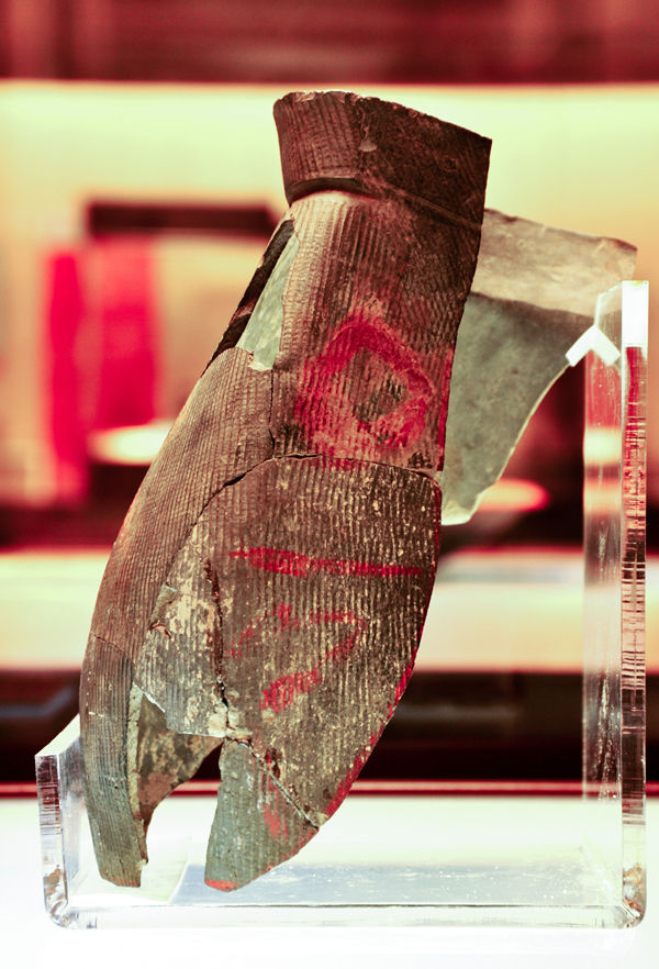 陶寺遗址出土的朱书扁壶,其上为朱砂书写的“尧”字