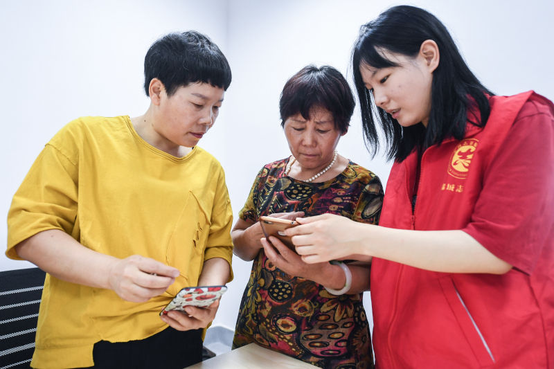 6月4日,在杭州市临安区锦城街道胜利社区,青年社工指导老人们用手机购物 徐昱/摄