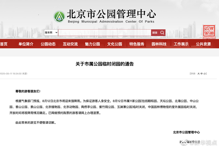 北京市公园管理中心11日晚发布关于市属公园临时闭园的通告。通告称,根据气象部门预报,8月12日北京市将迎来强降雨。为保证游客人身安全,8月12日市属11家公园(包括颐和园、天坛公园、北海公园、中山公园、香山公园、景山公园、北京植物园、北京动物园、陶然亭公园、紫竹院公园、玉渊潭公园)临时关闭,中国园林博物馆的室外展园临时关闭,开放时间将视降雨情况确定。已网络预约购票的游客请网上办理退票。(记者魏梦佳)