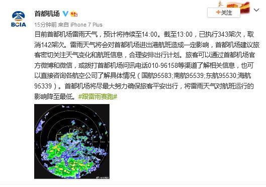 旅客可以通过首都机场官方微博和微信,或拨打首都机场问讯电话010-96158等渠道了解相关信息,也可以直接咨询各航空公司了解具体情况(国航95583;南航95539;东航95530;海航95339)。首都机场将尽最大努力确保旅客平安出行,将雷雨天气对航班运行的影响降至最低。