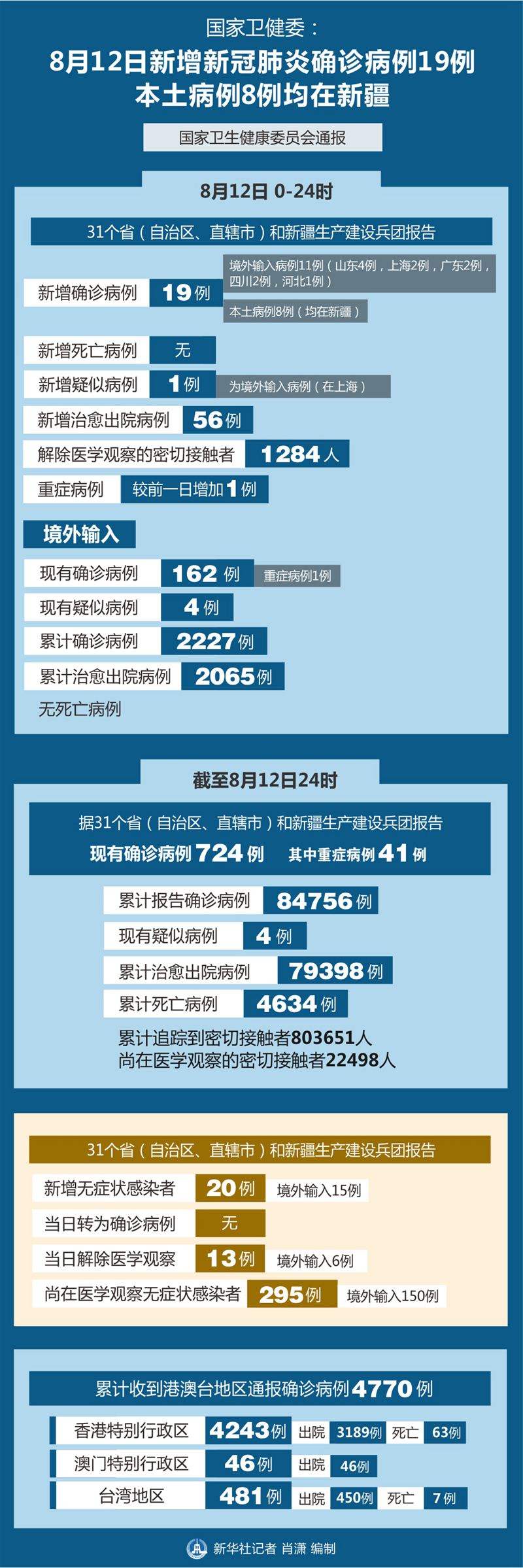 截至8月12日24时,据31个省(自治区、直辖市)和新疆生产建设兵团报告,现有确诊病例724例(其中重症病例41例),累计治愈出院病例79398例,累计死亡病例4634例,累计报告确诊病例84756例,现有疑似病例4例。累计追踪到密切接触者803651人,尚在医学观察的密切接触者22498人。