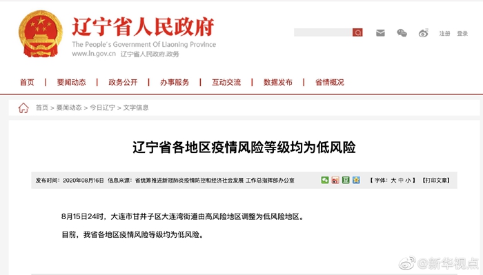 8月15日24时,大连市甘井子区大连湾街道由高风险地区调整为低风险地区。目前,辽宁省各地区疫情风险等级均为低风险。