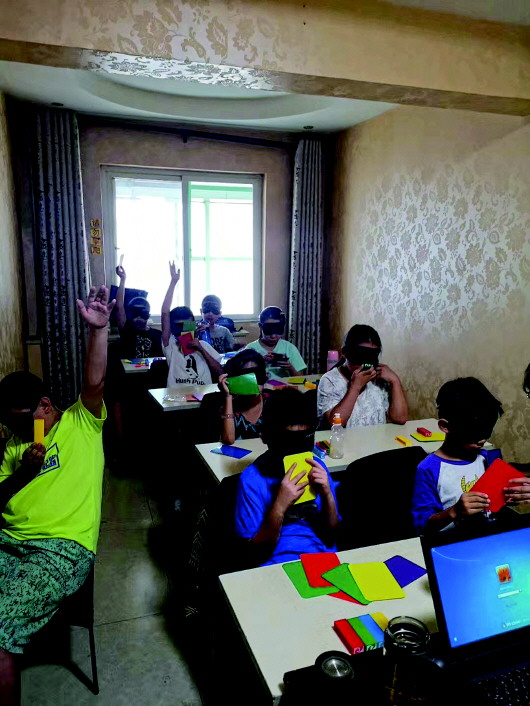 某培训机构让孩子蒙着眼睛感知颜色。 本报记者王菲菲摄