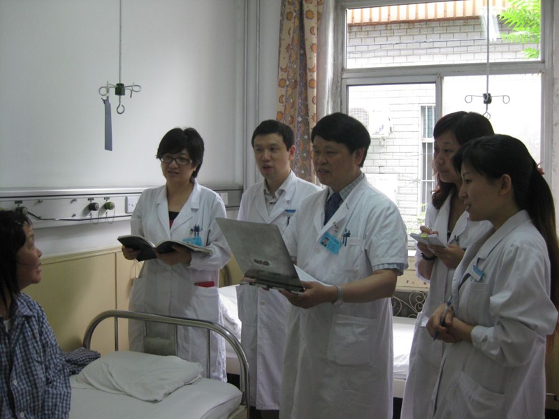 中国医学科学院肿瘤医院徐兵河教授(右三)、马飞教授(右四)携治疗团队在病房查问乳腺癌患者康复情况。图片由受访者提供